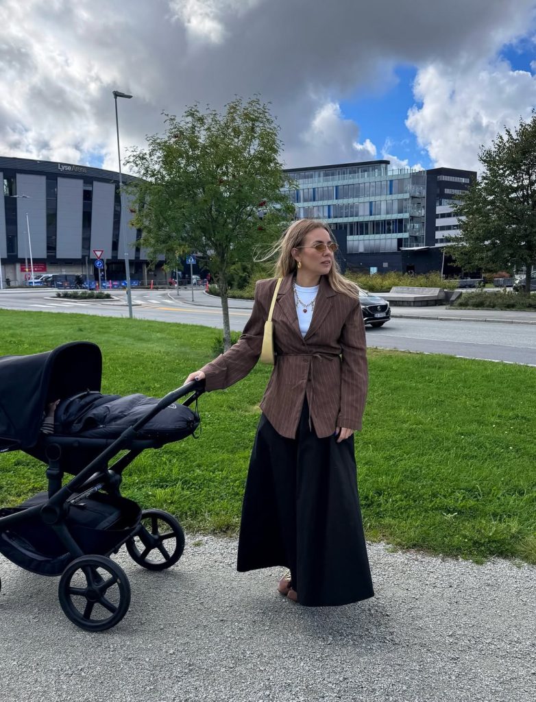 A pinstripe brown blazer cinched at the waist creates a strong yet comfy, structured presence—ideal for moms who love a classy, modern look while pushing a stroller through the park.