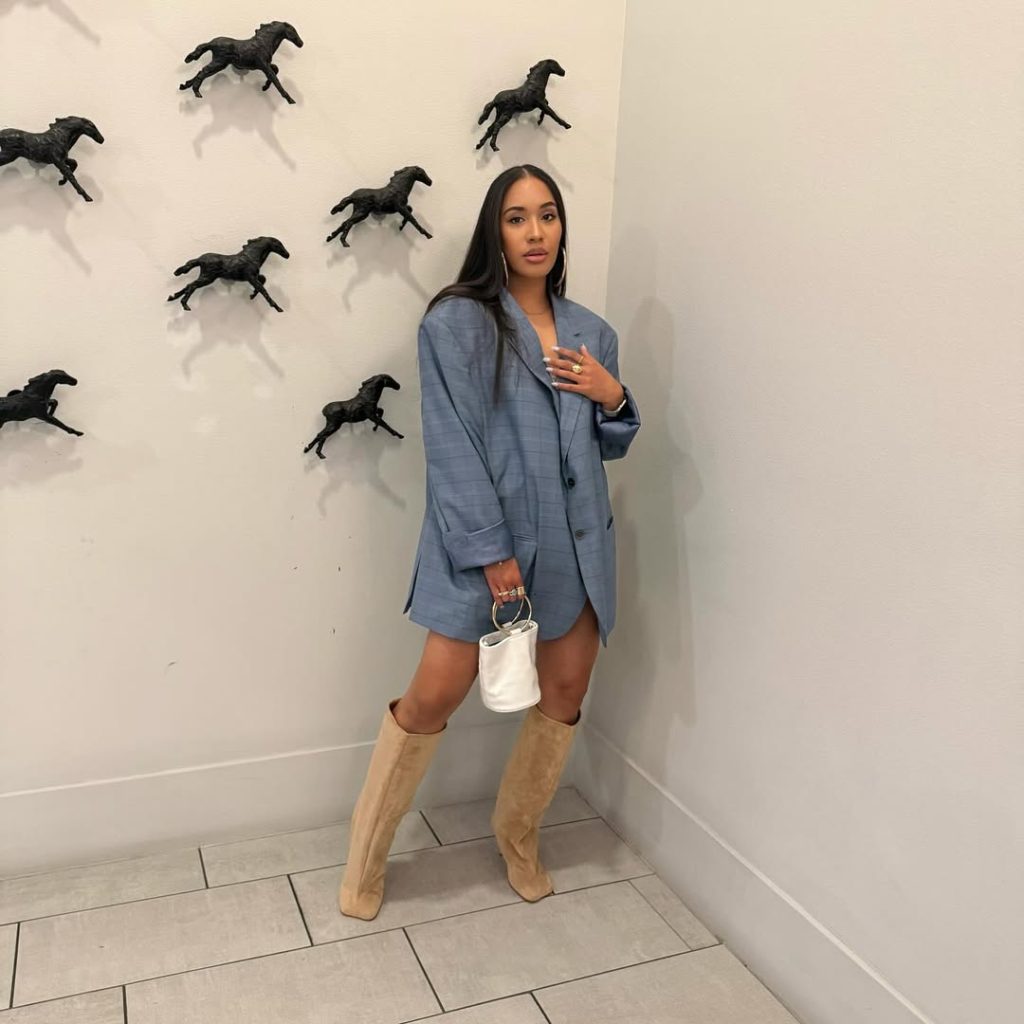 An oversized, muted blue blazer with suede-finish tall boots and a micro top-handle bag creates a sleek and bold, slightly edgy, and grunge-leaning silhouette and makes Mom ready for a casual dinner or a Disney day date without the kids.