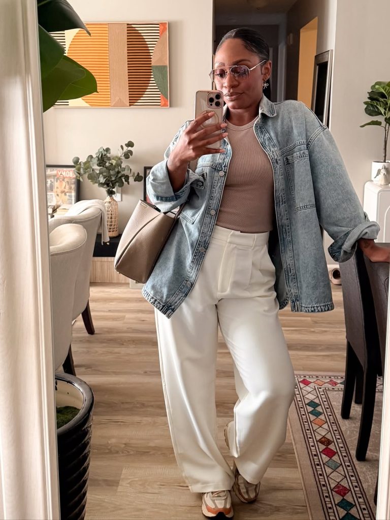 Ideal for grocery shopping on the weekends, watching kids play soccer, walking in nature on kid-friendly trails, or the spontaneous dance party play date. The relaxed sneakers add a unique touch. Have the option to add a denim jacket in spring and a puffer vest in the winter. Just don’t add too fragile styles; the sneakers are bold to create a unique, memorable outfit.