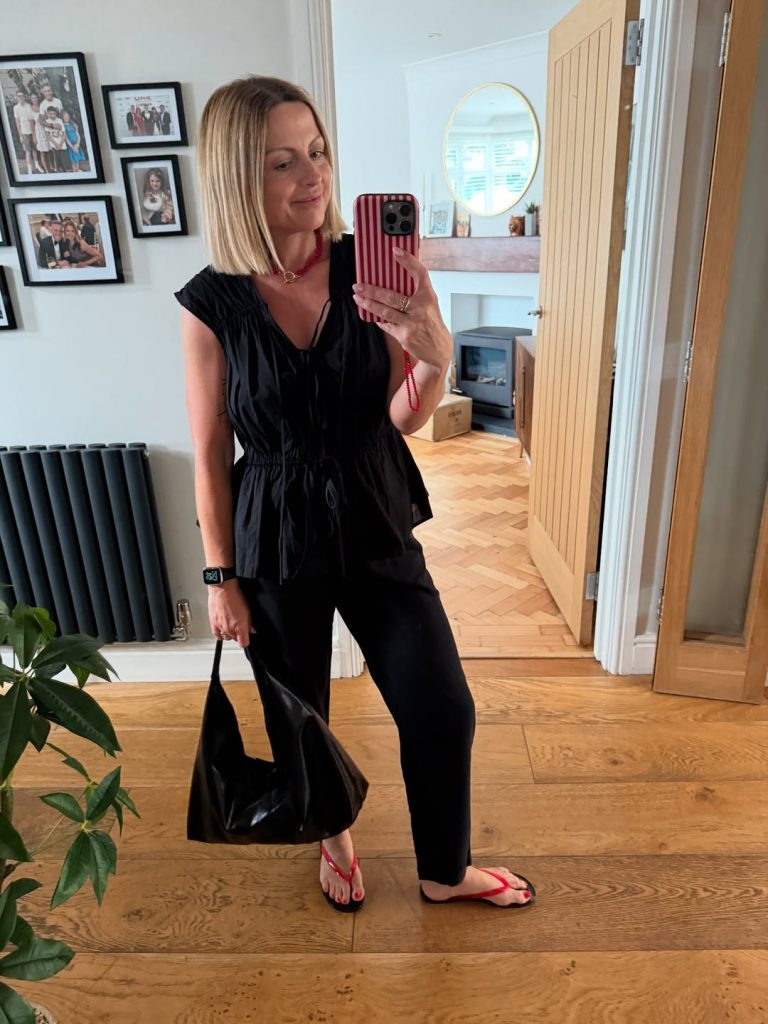 A monochrome black top-and-pants combo brightened with bold red sandals—a polished yet easy outfit for everyday errands or casual evenings out.