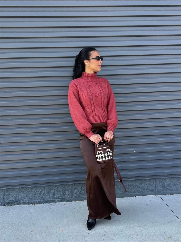 A deep berry knit with a chocolate satin skirt brings elegant contrast—a classy, slightly aesthetic choice for moms wanting something refined.