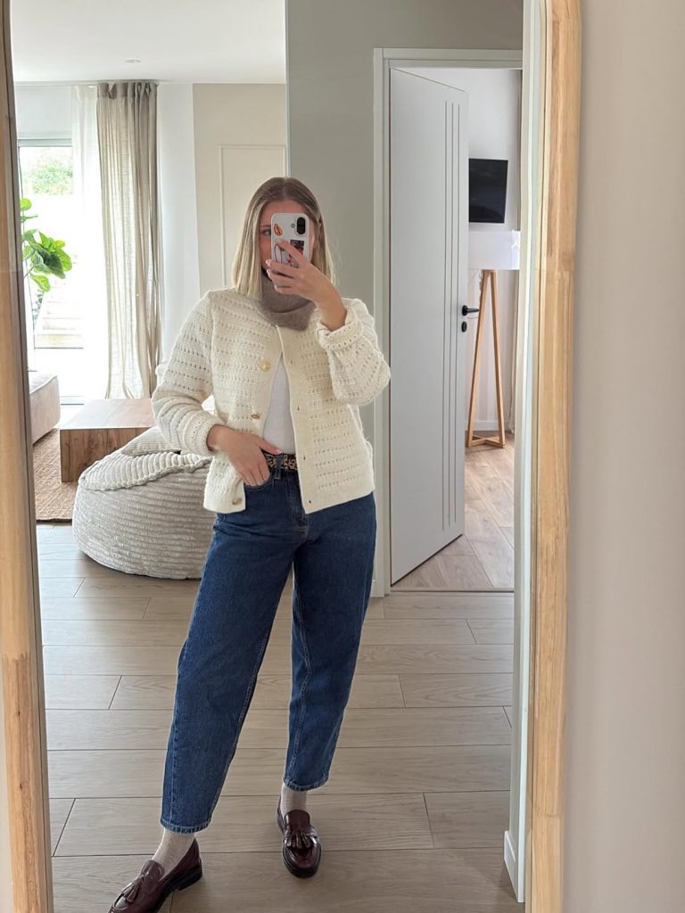 Soft textures meet crisp denim in this chic and slightly millennial look. The creamy cardigan paired with structured jeans makes it timeless, warm, and ideal for winter, fall, or breezy spring days.