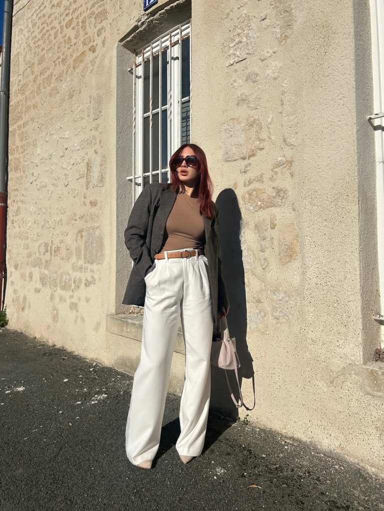 Taupe, white, and charcoal create a refined, modern outfit that feels crisp and capable—a perfect blend of chic and practical style for 2026.