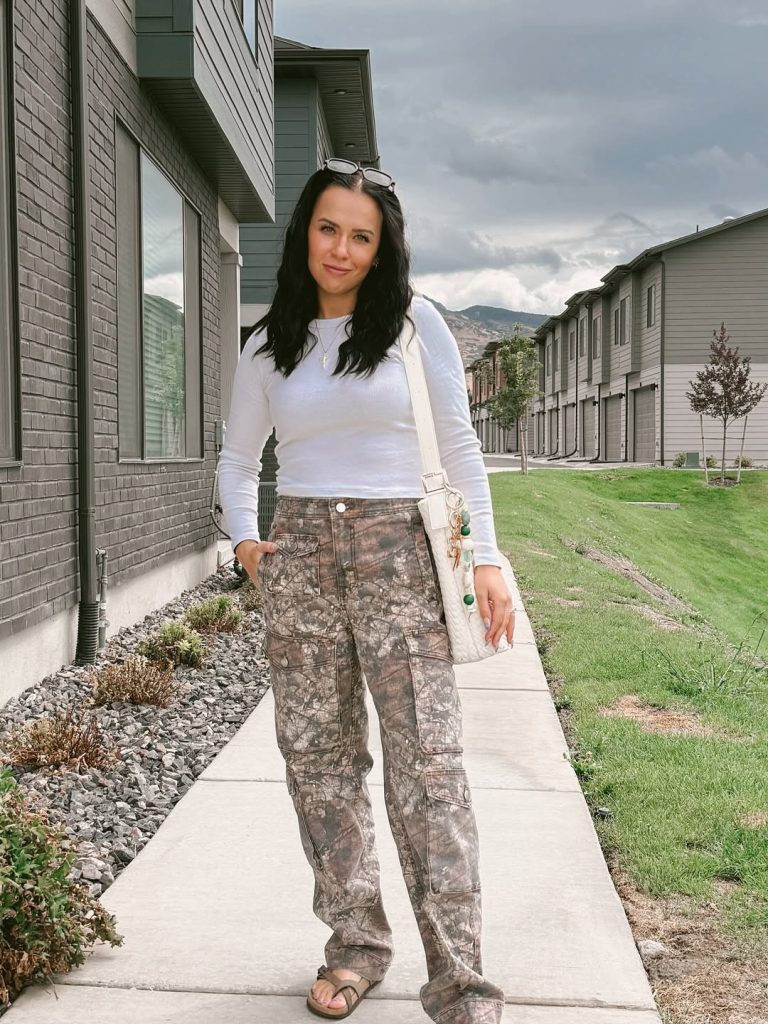 A fitted white top and printed cargo pants blend casual comfort with a slightly edgy, outdoorsy vibe—great for moms who love a touch of street style.
