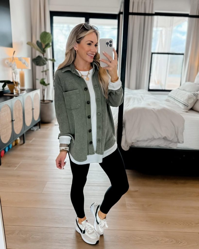 A cozy green shacket layered over a white top with black leggings and Nike sneakers delivers peak sporty, everyday comfort for active moms.