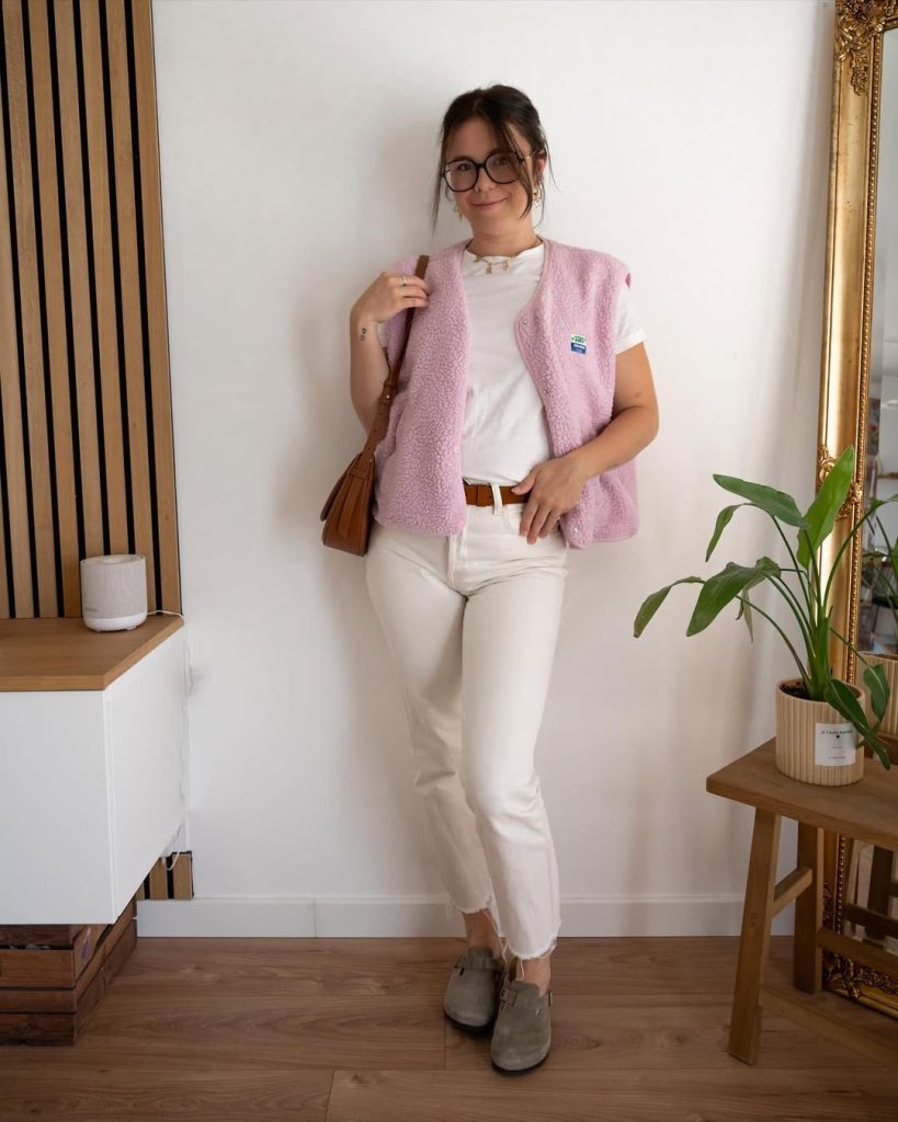 A cozy pink fleece vest layered over crisp whites offers a sweet, lightly crunchy, subtly boho vibe—great for moms who love soft tones with personality.