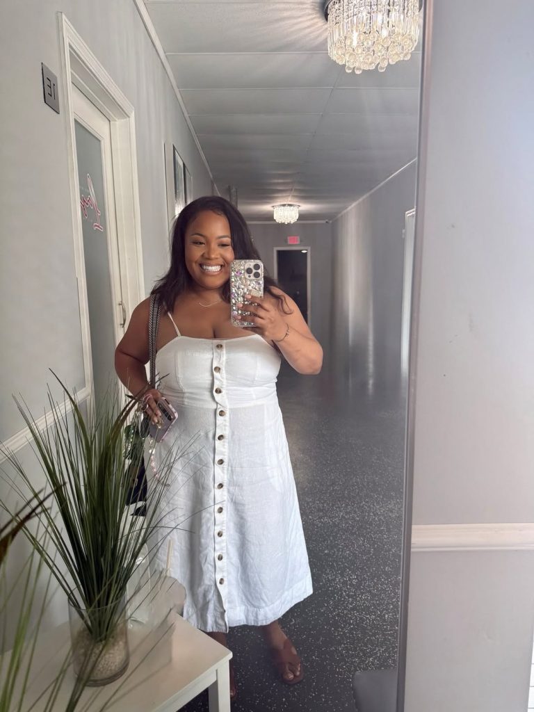 A radiant, sun-kissed look built around a feminine button-down dress—unapologetically cheerful and perfect for warm weather. The silhouette is naturally flattering, airy, and wonderfully summer-oriented, making it a standout mom outfit idea for a 2026 staple.