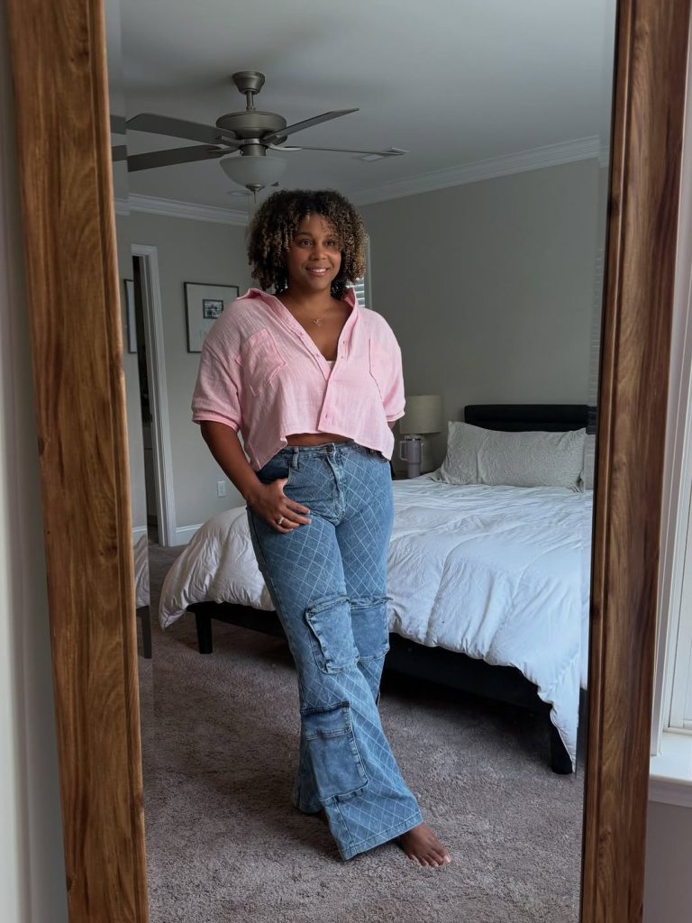 - Pink cropped button-up shirt—lightweight, relaxed structure