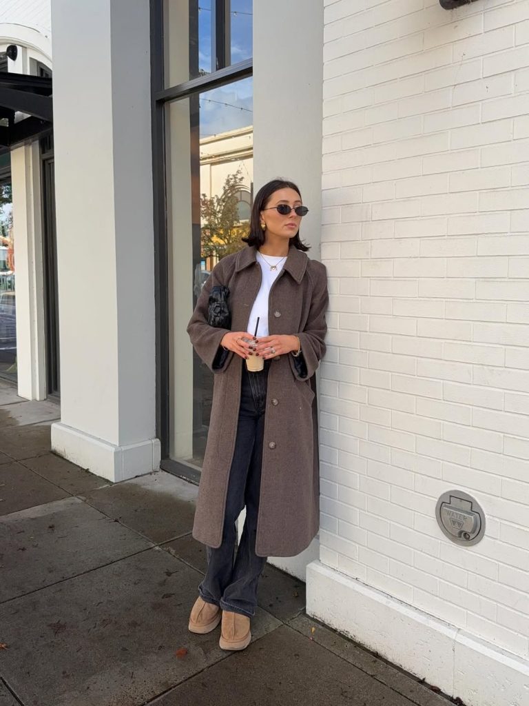 Moms know that mornings can feel like a sprint, especially when juggling drop-offs before the sun is fully awake. This outfit nails that easy, clean aesthetic while staying warm in early spring or fall. To personalize it, consider adding a 90s-inspired claw clip or a bold berry-tone lip for contrast. Avoid overly patterned scarves—they can distract from the coat’s sleek silhouette. Perfect for school runs, café moments, or a casual meeting at your favorite local spot.