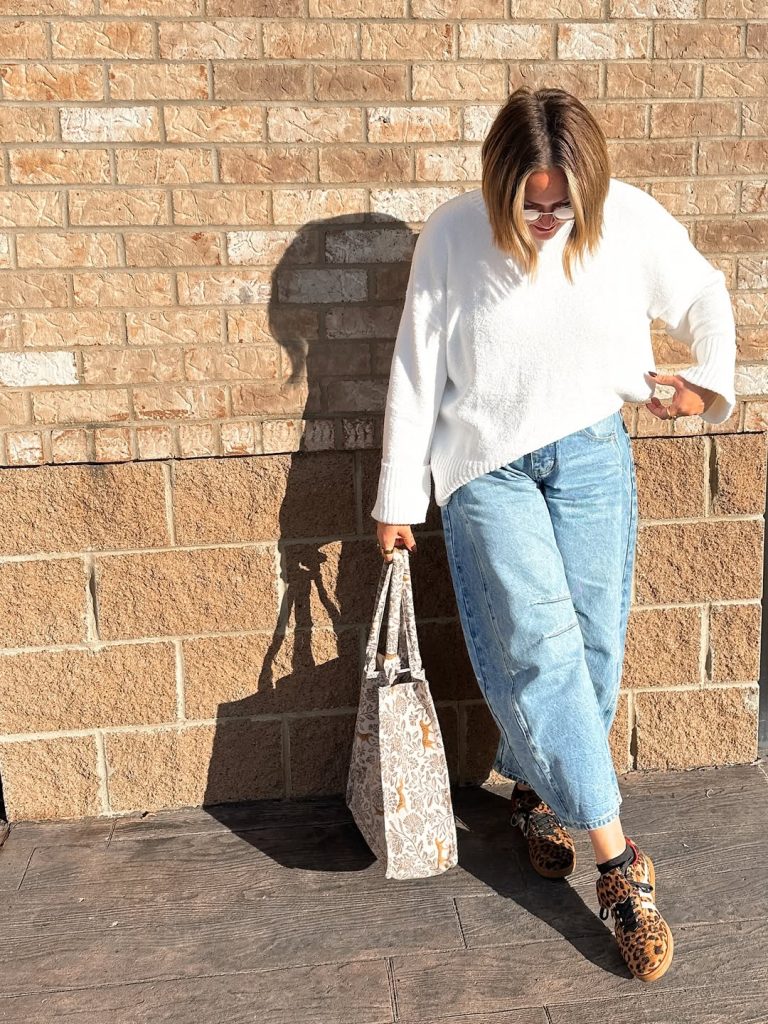 - White sweater—soft, loose, and breathable