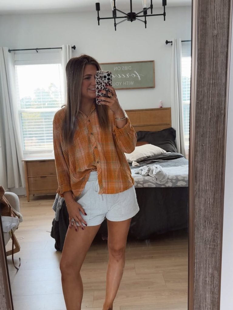 - Orange plaid button-down shirt—tied front, warm-toned checks
