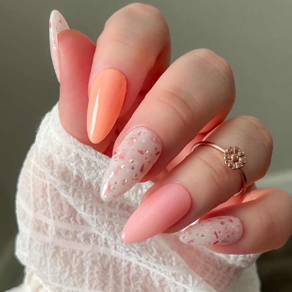 These soft peach nails blend creamy pastel tones with playful confetti details, giving a dreamy balance between elegance and fun. The light coral base paired with iridescent specks feels like a celebration of spring mornings—fresh, delicate, and effortlessly feminine. This look gives that “princess but make it modern” vibe without feeling overdone.