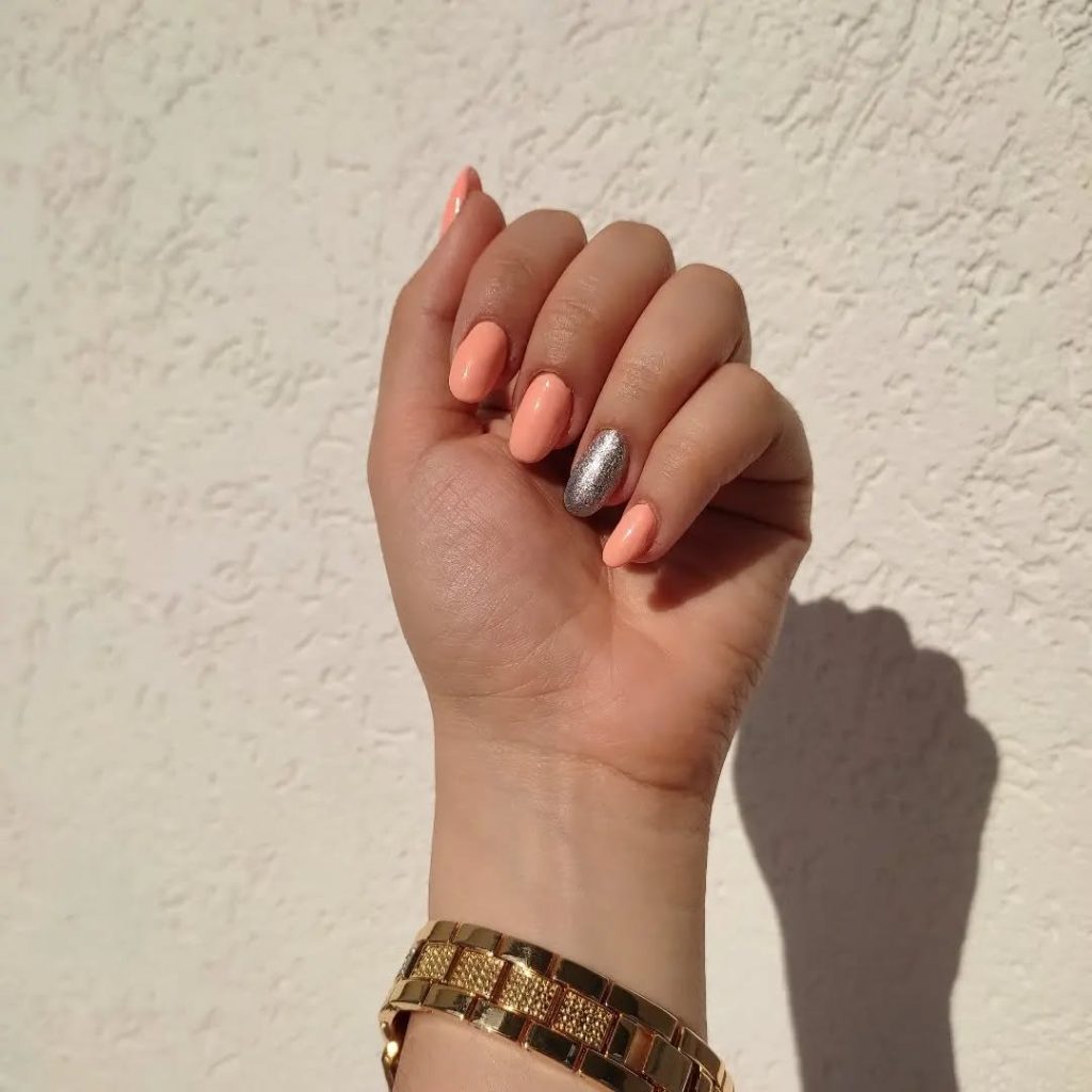 This peach and silver combo feels playful yet refined, with a hint of futuristic flair. The soft orange tone warms up the hand, while the metallic accent nail adds a cool, modern edge. It’s the kind of design that transitions easily from day to night—fresh, elegant, and versatile.