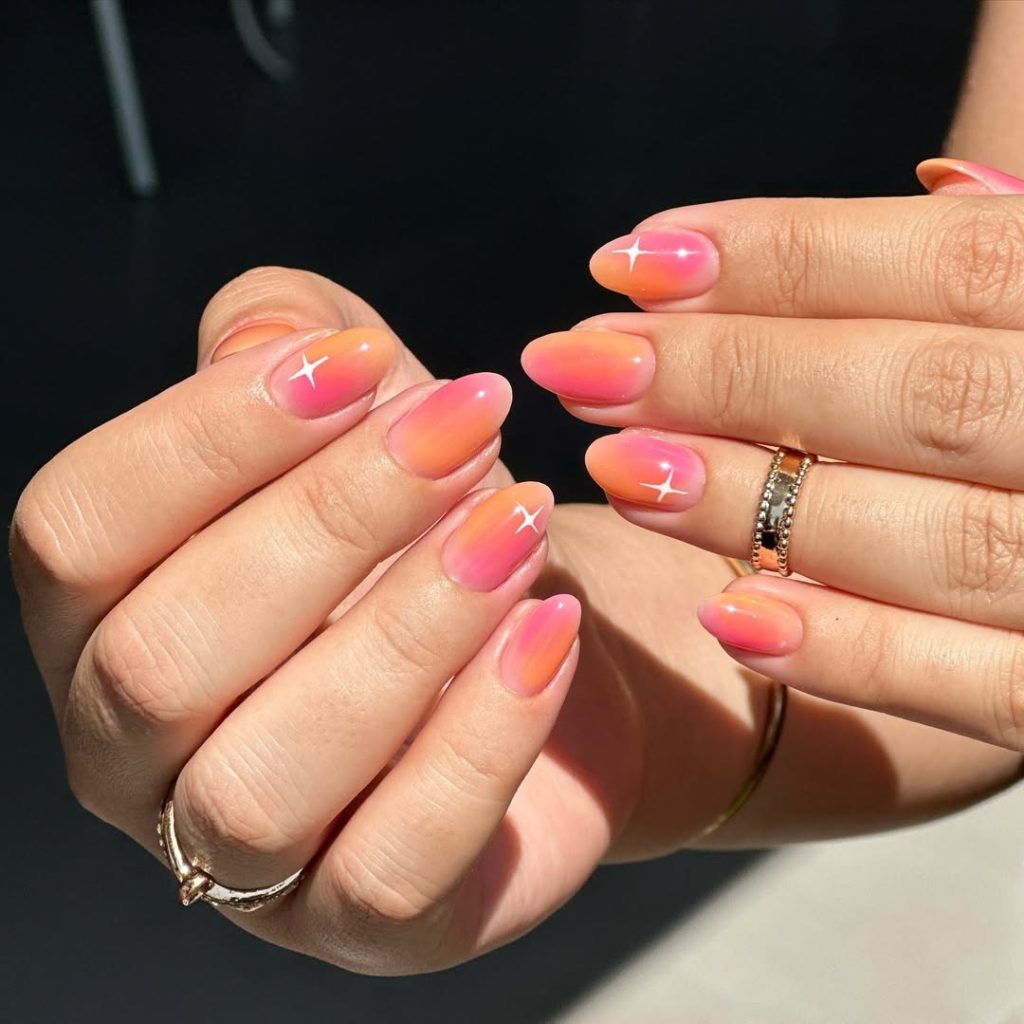 This sunset peach manicure glows with warmth and romance, blending pink and orange in a seamless ombre that feels like a summer evening sky. The delicate sparkle detail adds a hint of magic, turning a simple design into something softly enchanting. It’s joyful, artistic, and full of that vacation-in-the-sun energy.