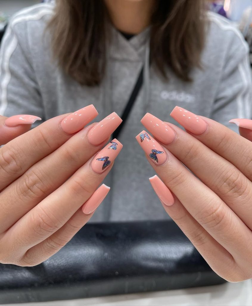Soft peach acrylic nails with butterfly art bring a touch of whimsy to everyday style. The warm pastel shade highlights the delicate metallic blue wings, adding a youthful yet elegant energy. It’s a design that feels romantic and full of personality—the perfect blend of simplicity and detail.