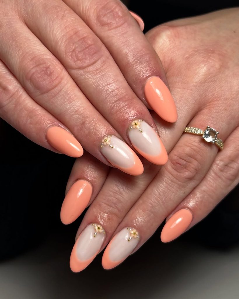 These peach French tips with tiny gold accents redefine elegance with a modern edge. The creamy orange hue radiates warmth, while the subtle bead embellishments near the cuticle add a jewelry-like touch. It’s graceful, polished, and ideal for special occasions or elevated everyday wear.