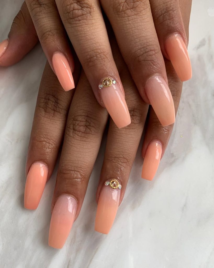 These peach ombre nails with crystal accents are pure sophistication. The subtle gradient from nude to pastel orange feels airy and romantic, while the gemstone detail adds just the right amount of sparkle. It’s that perfect middle ground between classy and playful.