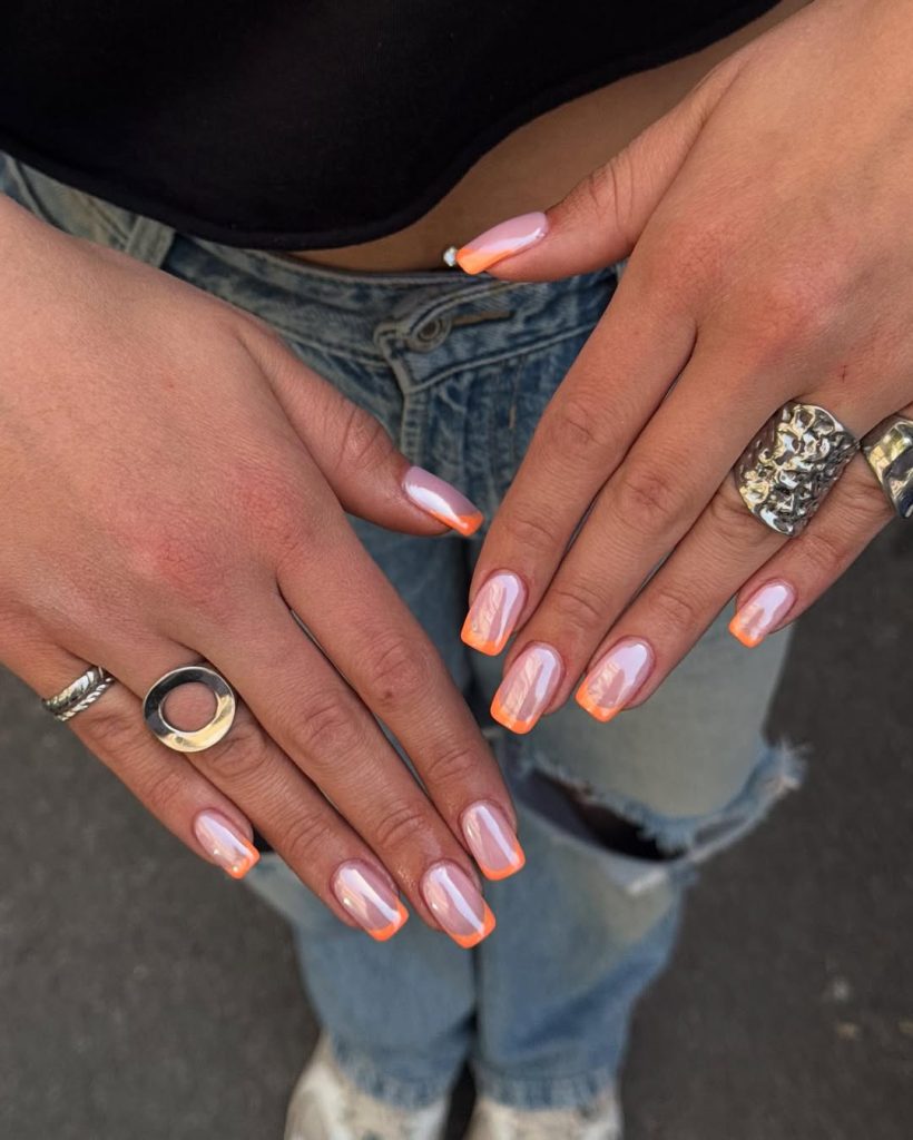 These peach French tips glazed with a subtle touch of orange and a milky pink base create a sunlit glow. A classic design wins modernity. It becomes a timeless staple. This design works best on nails with a square or squoval shape. The polish’s genius lies in its ability to transcend seasons. An easy polish in summer 2026 and in all other seasons. Chill with silver and denim and nail log to be as modern as possible.
