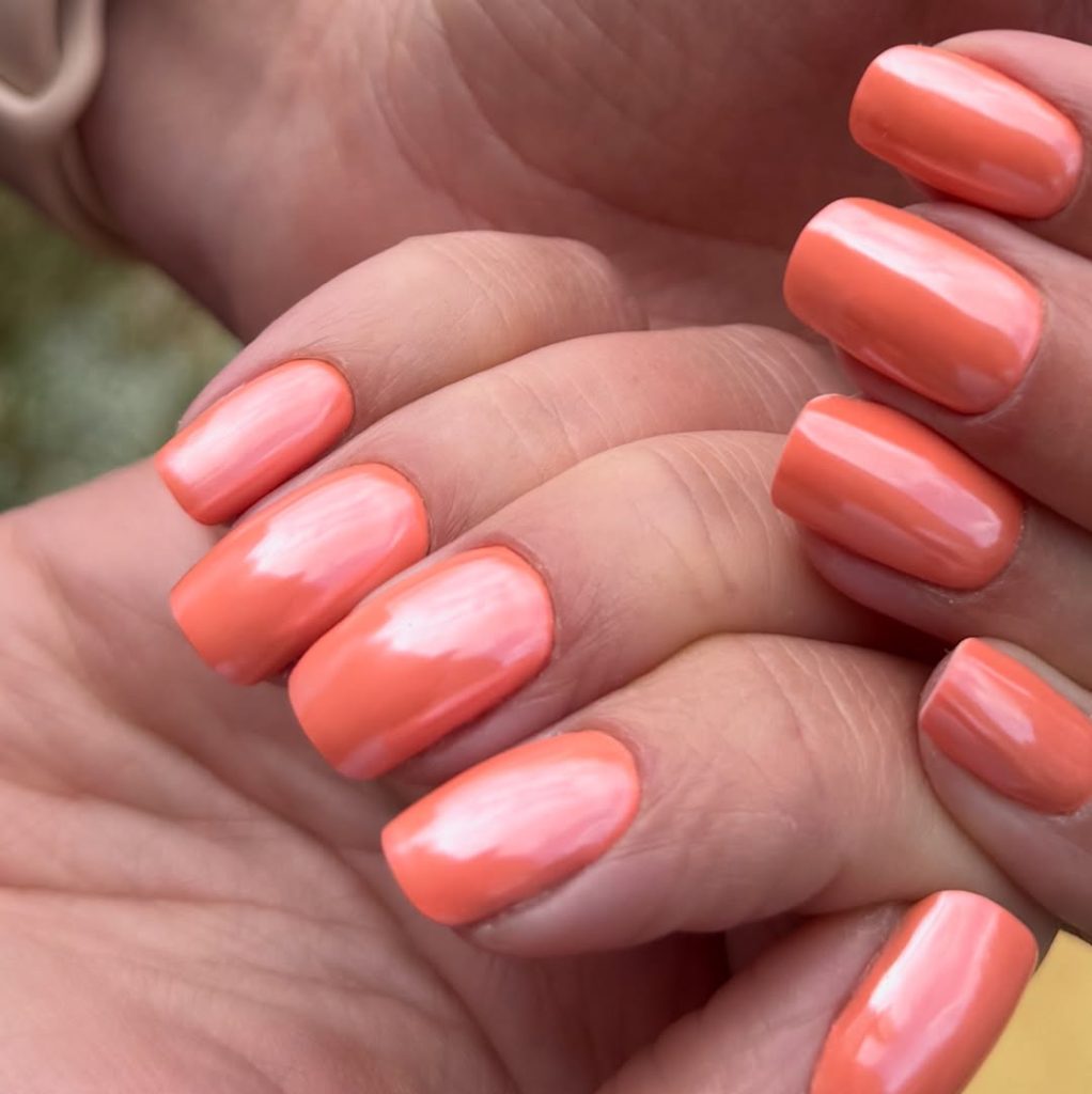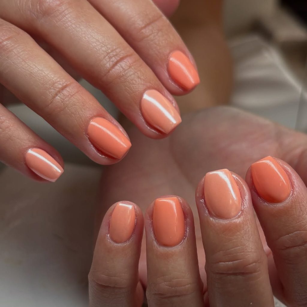 These short glossy peach nails prove that minimalism can still make a statement. The smooth finish and even color saturation create an ultra-clean, polished look. It’s simple, fresh, and gives off a soft glow that’s perfect for any season.