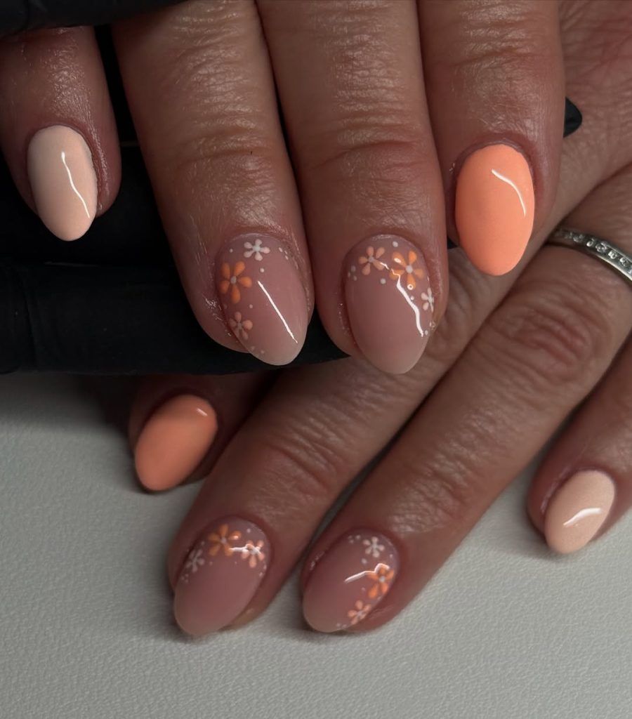 Tiny hand-painted flowers bloom over neutral and peach tones in this delicate nail design. It’s soft, feminine, and full of charming detail—a little nod to spring gardens. The mix of beige and orange hues feels organic, while the florals add a touch of artful whimsy.