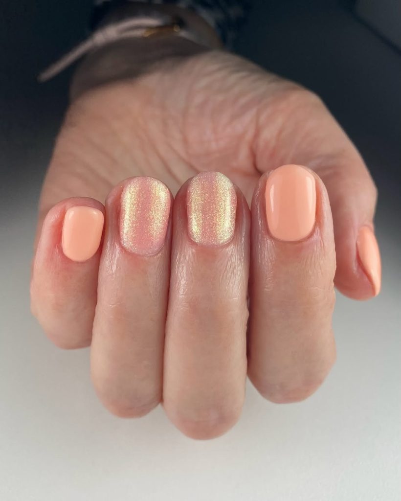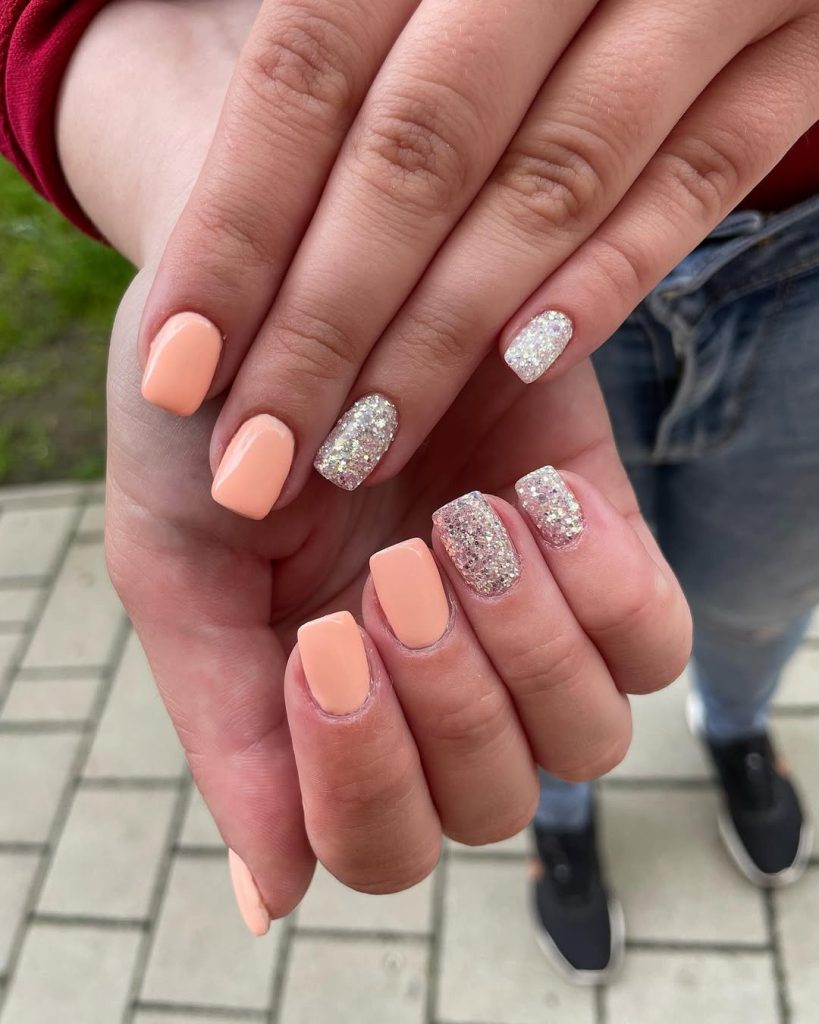 Perfect for short square nails, this design works beautifully for weddings or celebrations. The color contrast adds texture and depth, while the glitter gives an instant dose of glam. It’s a top inspo pick for peach nail lovers who crave a little sparkle.