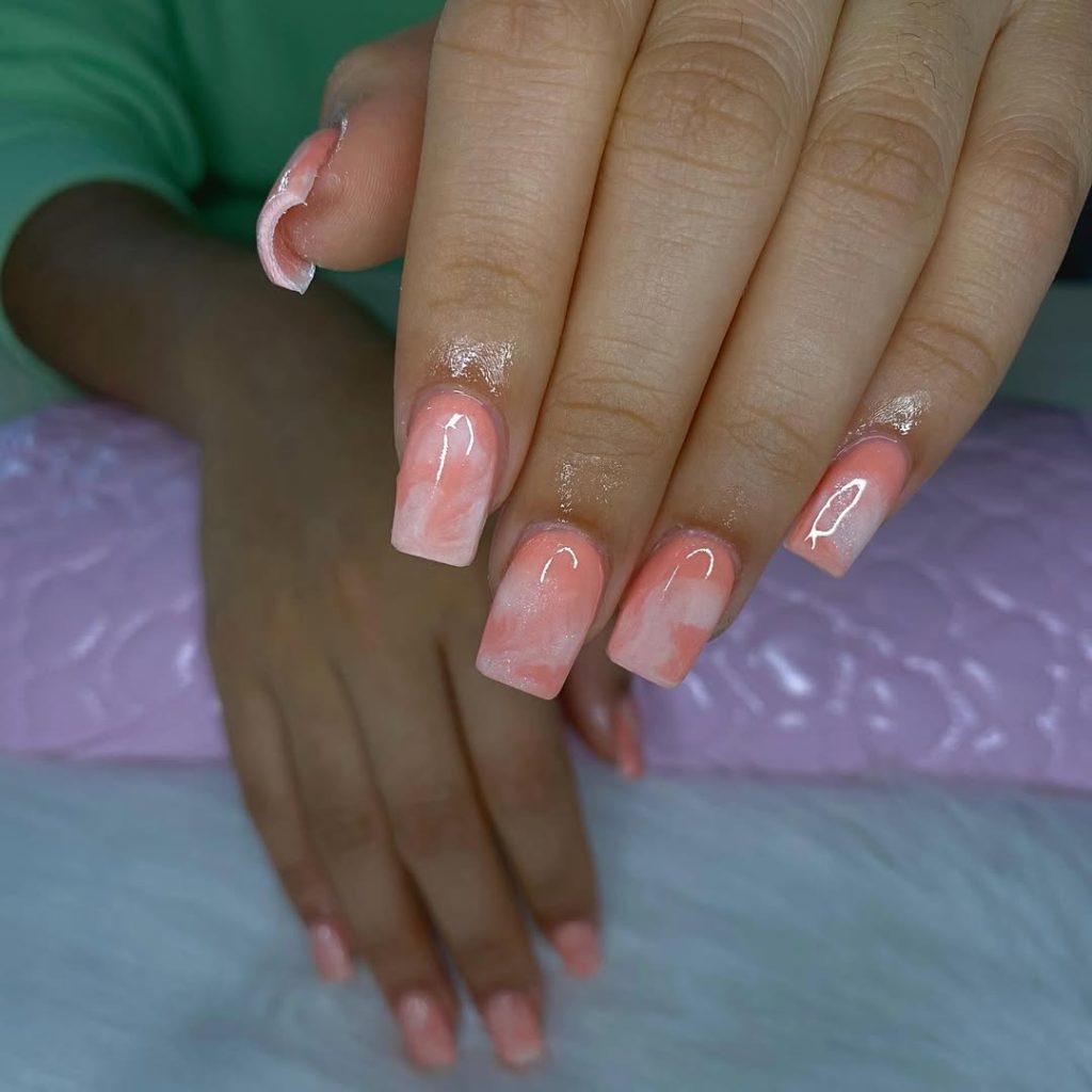 This dreamy set of peach marble nails is pure art—a glossy swirl of light coral and pale orange that mimics the natural beauty of polished stone. The look feels soft and luxurious, catching the light in a way that enhances the depth of each design. It’s the perfect manicure for someone who loves color without chaos.