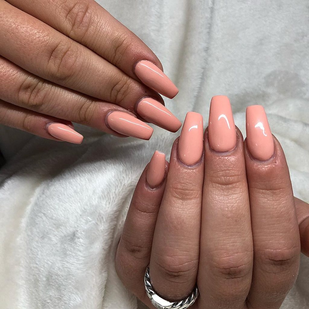 These glossy peach acrylics are all about clean simplicity and elegance. The warm coral tone gives nails a soft pop of color that is refined yet playful. The high-shine finish gives the illusion of polished nails at all times; therefore, effortless elegance is achieved in one swipe.