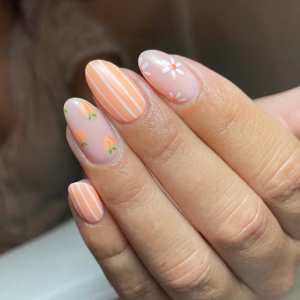 These peach nails with stripes and daisies are pure spring happiness. The playful mix of tiny floral art and fresh linear details adds character without overwhelming the look. Soft pastel orange pairs beautifully with white accents, creating a cheerful, artistic vibe that feels light and trendy.