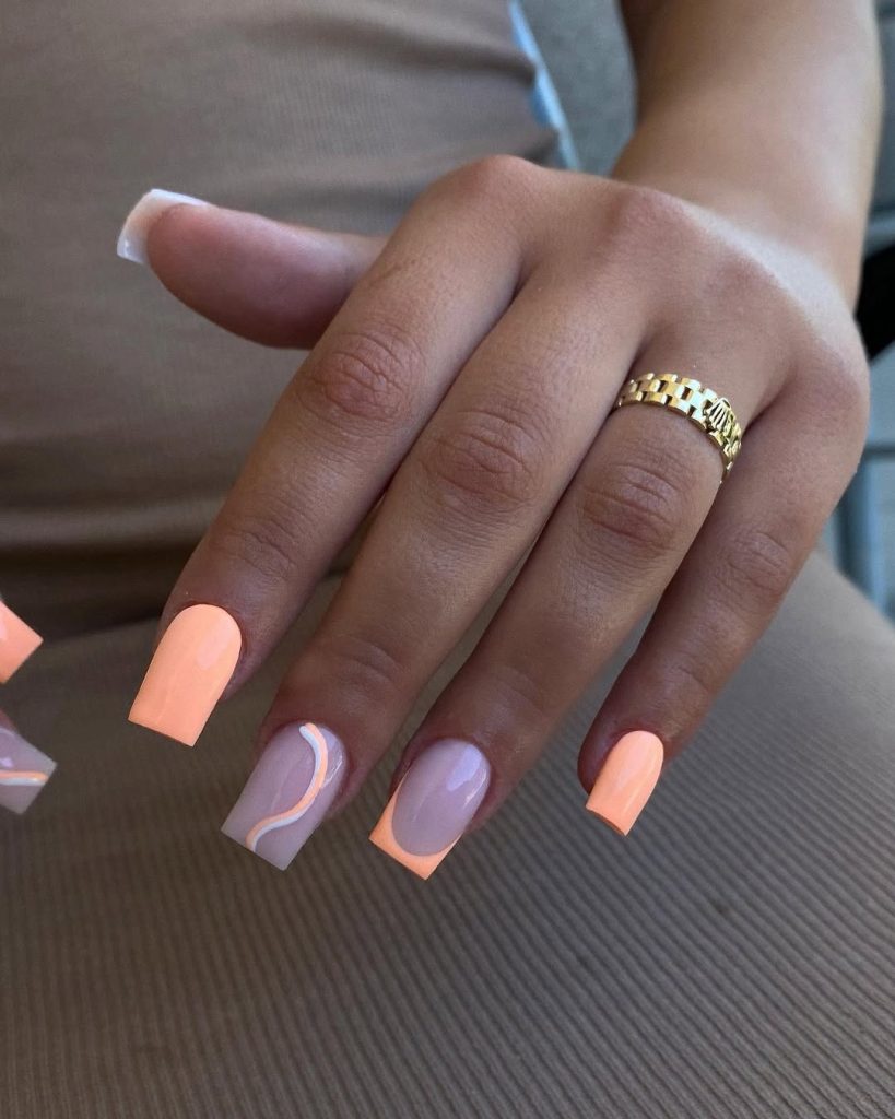 Best for medium-length square nails, this look complements both neutral wardrobes and playful summer fits. To make the design pop, keep the edges glossy and the peach polish smooth. It’s ideal for anyone who loves modern design ideas without going full neon or glitter-heavy.