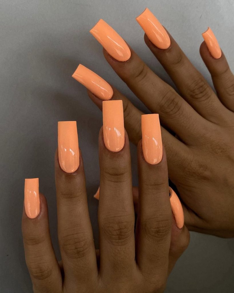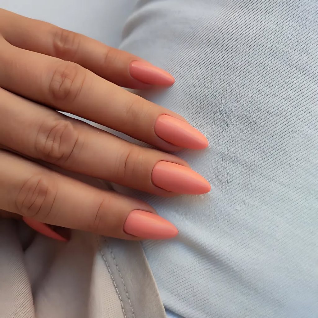 These bright peach nails are the essence of bold femininity—fun, confident, and glowing with energy. The glossy polish enhances the warmth of the orange tone, making it a statement color for tanned or deep skin tones. It’s the kind of manicure that instantly lifts your mood.