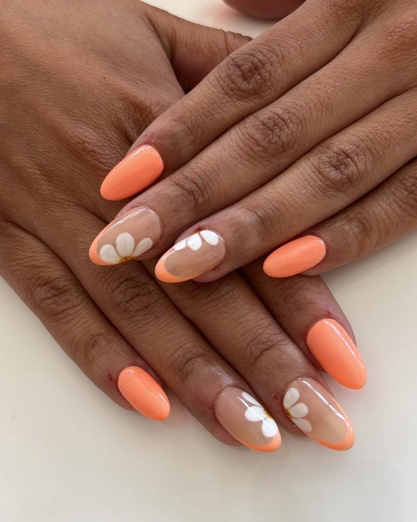 Playful and cheerful, these peach nails with white floral art feel like a summer picnic on your fingertips. The soft orange tone brightens your hands instantly, while the daisy accents bring a touch of whimsy. It’s the kind of design that makes you smile every time you glance at it—light, joyful, and perfect for sunny days.