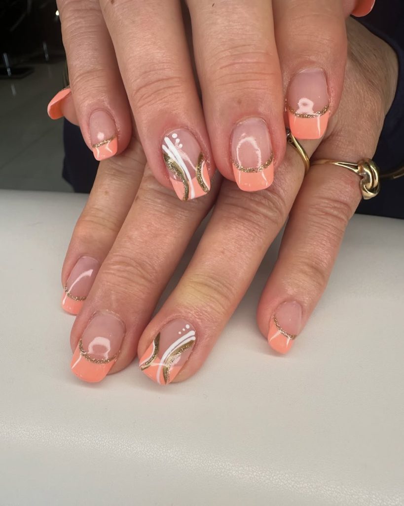 Classic meets chic in this peach and gold French tip design. The light coral base gives a refreshing glow, while the gold accents add a touch of luxury. The curved lines bring movement and art to the nails, turning a simple manicure into something beautifully detailed.