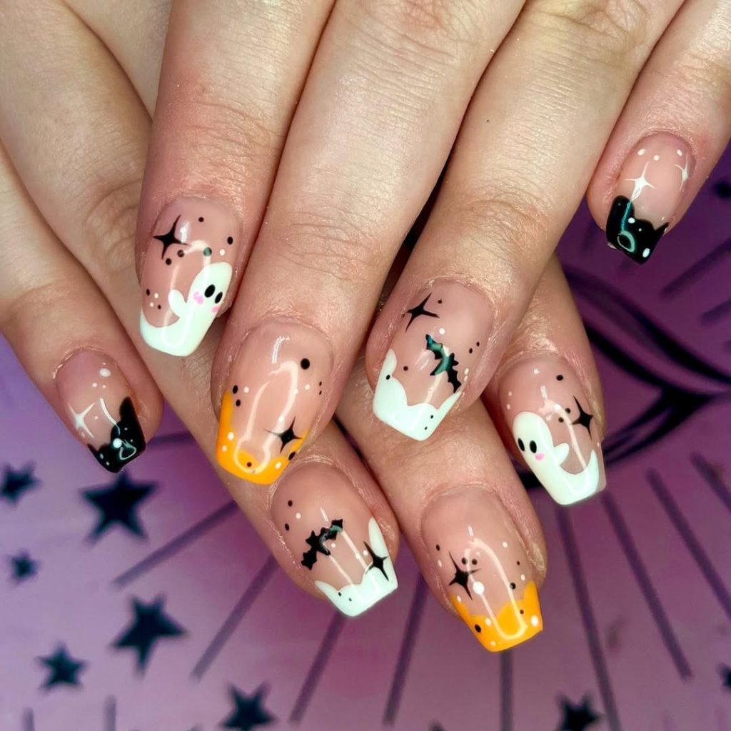 10. Cute Halloween Short Coffin Nails with Ghost and Star Details