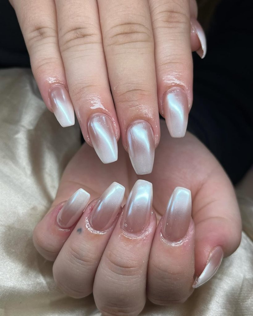 11. Pearl-Shine Short Coffin Nails with a Soft Iridescent Glow