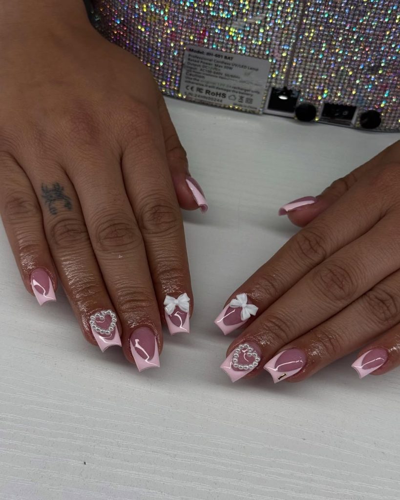 17. Pink Ribbon Short Coffin Nails with Heart and Bow Details