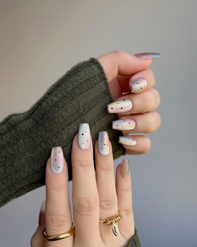 2. Soft Chrome Gradient Short Coffin Nails with Minimalist Speckles