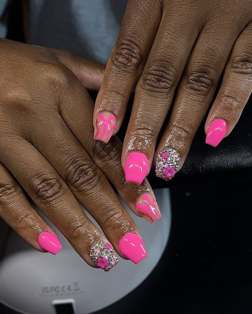 20. Bright Pink Short Coffin Nails with Glitter and Floral Accents