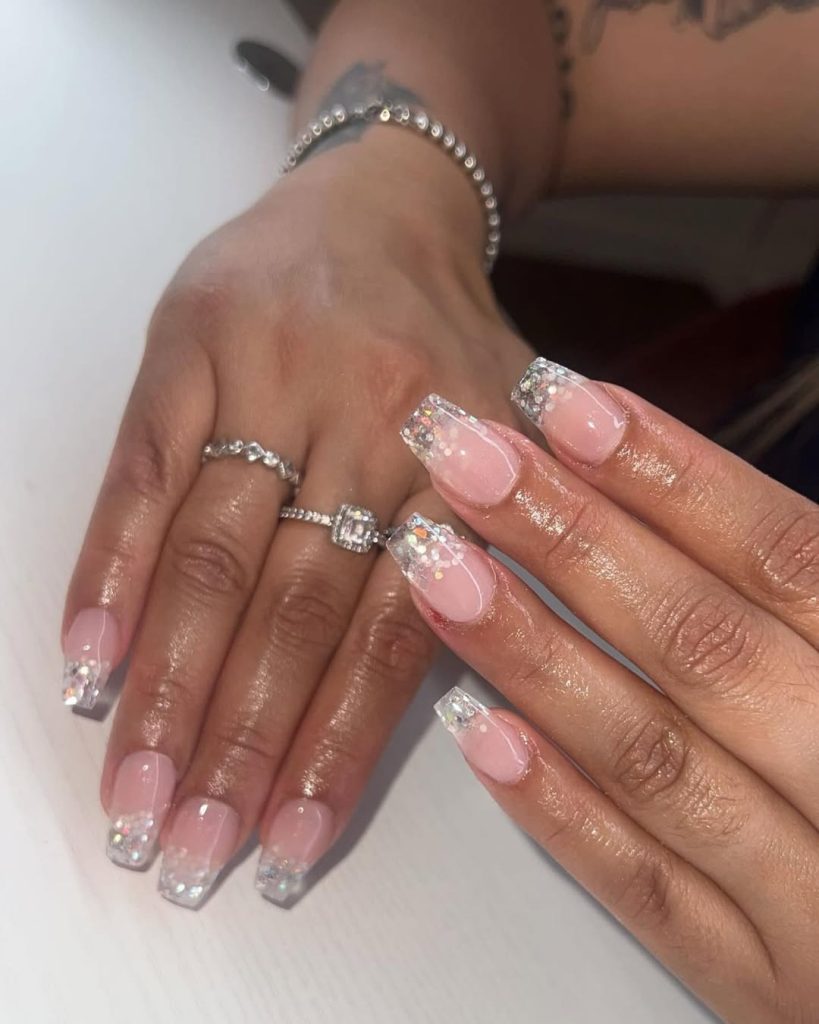 22. Crystal-Tip Short Coffin Nails with Pink Gloss Base