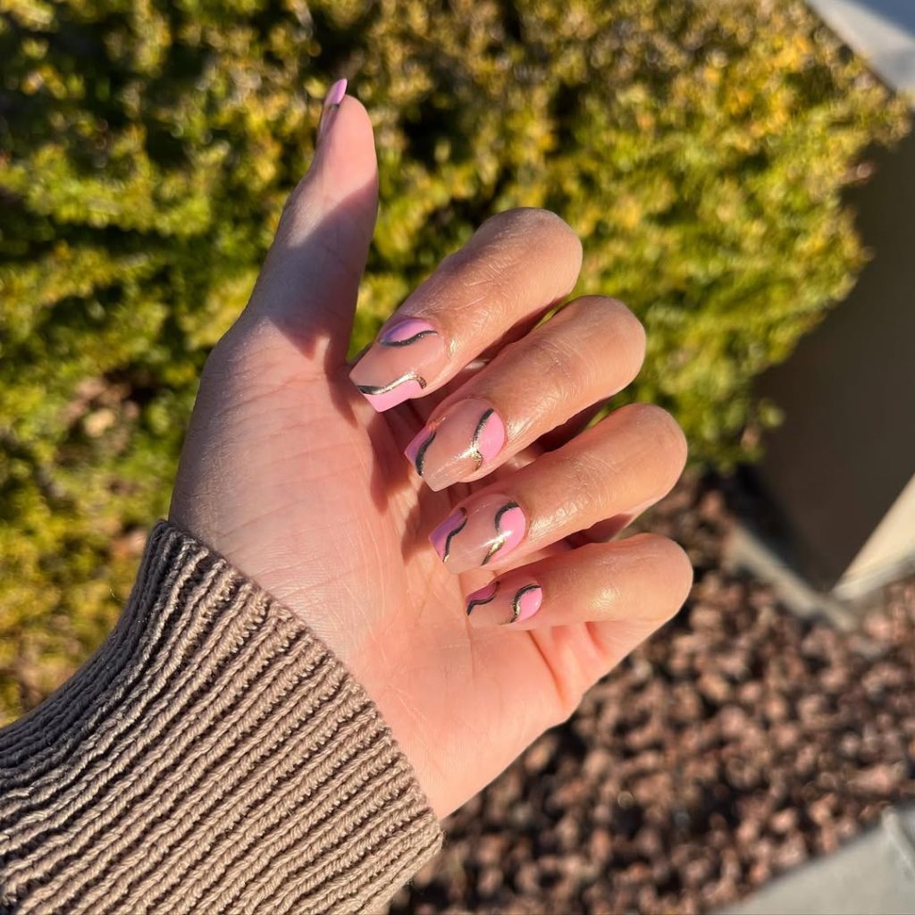 This look has such an artistic and sunset-like quality to it that it’s absolutely captivating to look at. The look has soft pink swirls that flow effortlessly across the nude background with the subtlest hint of silver to it. You get to sport a cute look that has artistic design elements without overdoing it to perfection to capture those perfect sunny days with your perfect casual wear.