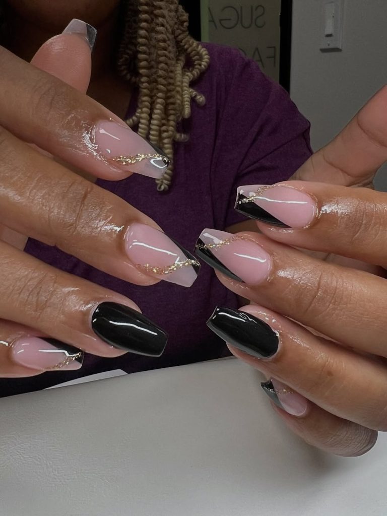 25. Black and Gold Short Coffin Nails with Glam French Tips