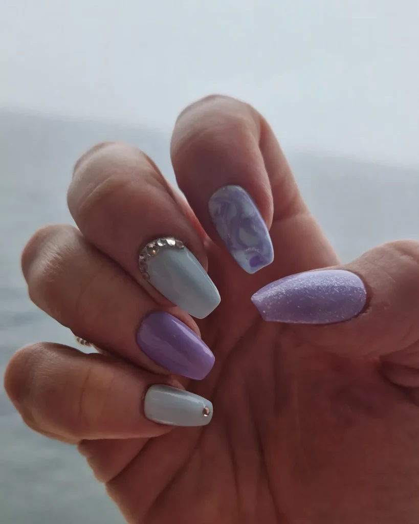 If you want to get that taste of lavender magic on your nails without making them look overdone or too loud, this design is the perfect solution. Each nail art has its own unique personality that ranges from marble to the sparkling effect—ensuring that you get the best artistic look without going overboard with it.
