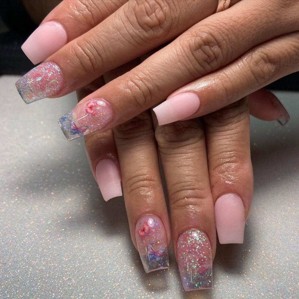 5. Soft Pink Glitter-Tip Short Coffin Nails with Delicate Butterfly Art