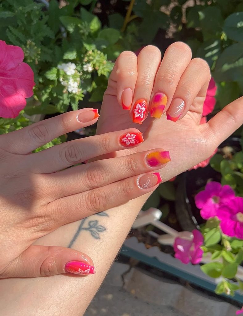 6. Tropical Sunset Short Coffin Nails with Bold Floral Art