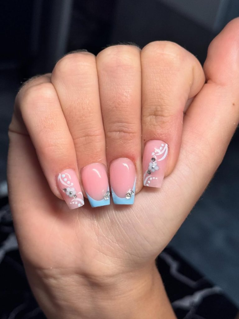 These nails are like a refreshing spring breeze on a hot day—soft, delicate, and slightly quirky. The baby blue French tip combined with the tiny crystals provides this look with a lovely childish touch without making it look mature and boring in the process. The combination of pastel pink and baby blue provides an excellent clean look that is ideal for those who want something that is pretty without going overboard.