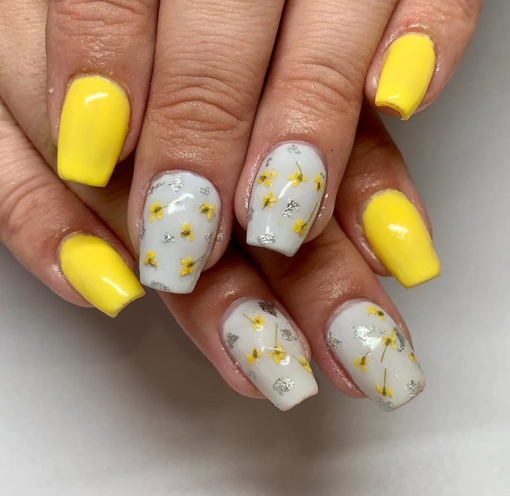 This nail art is just about sunshine—it is bright, cheerful, and full of warmth. The yellow nail color ensures that you are instantly happy, and the soft floral designs on the white background are just the right amount of adorable.