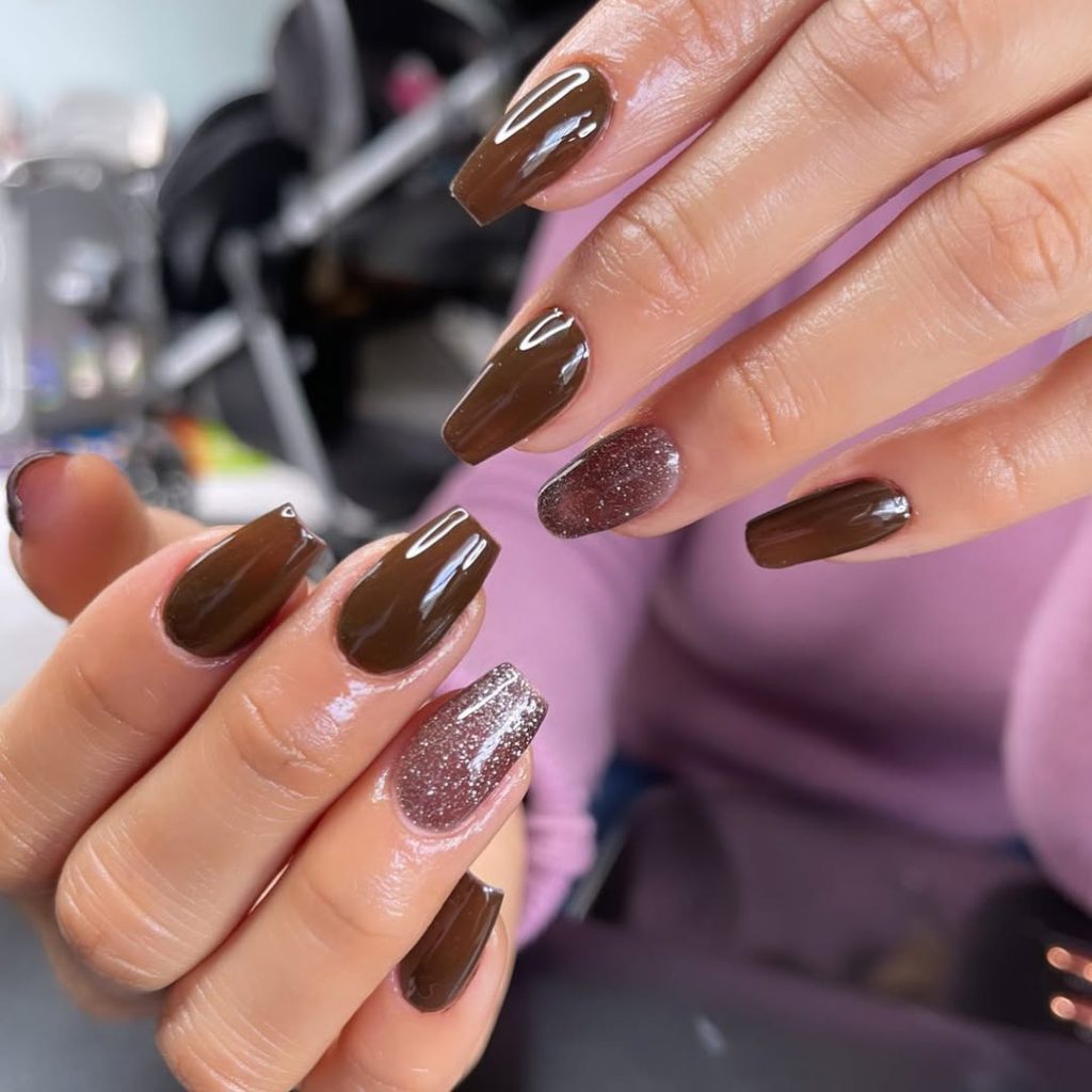 9. Deep Chocolate Short Coffin Nails with Glitter Accent