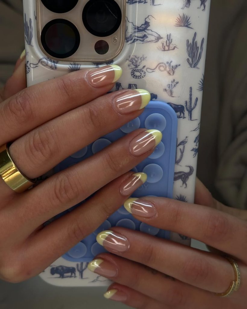 There’s a timeless freshness to this manicure. The sheer nude base feels polished and natural, while the pale yellow French tips add a gentle hint of spring sunshine. It’s understated, clean, and quietly confident—perfect if you love nails that feel put-together without drawing too much attention.