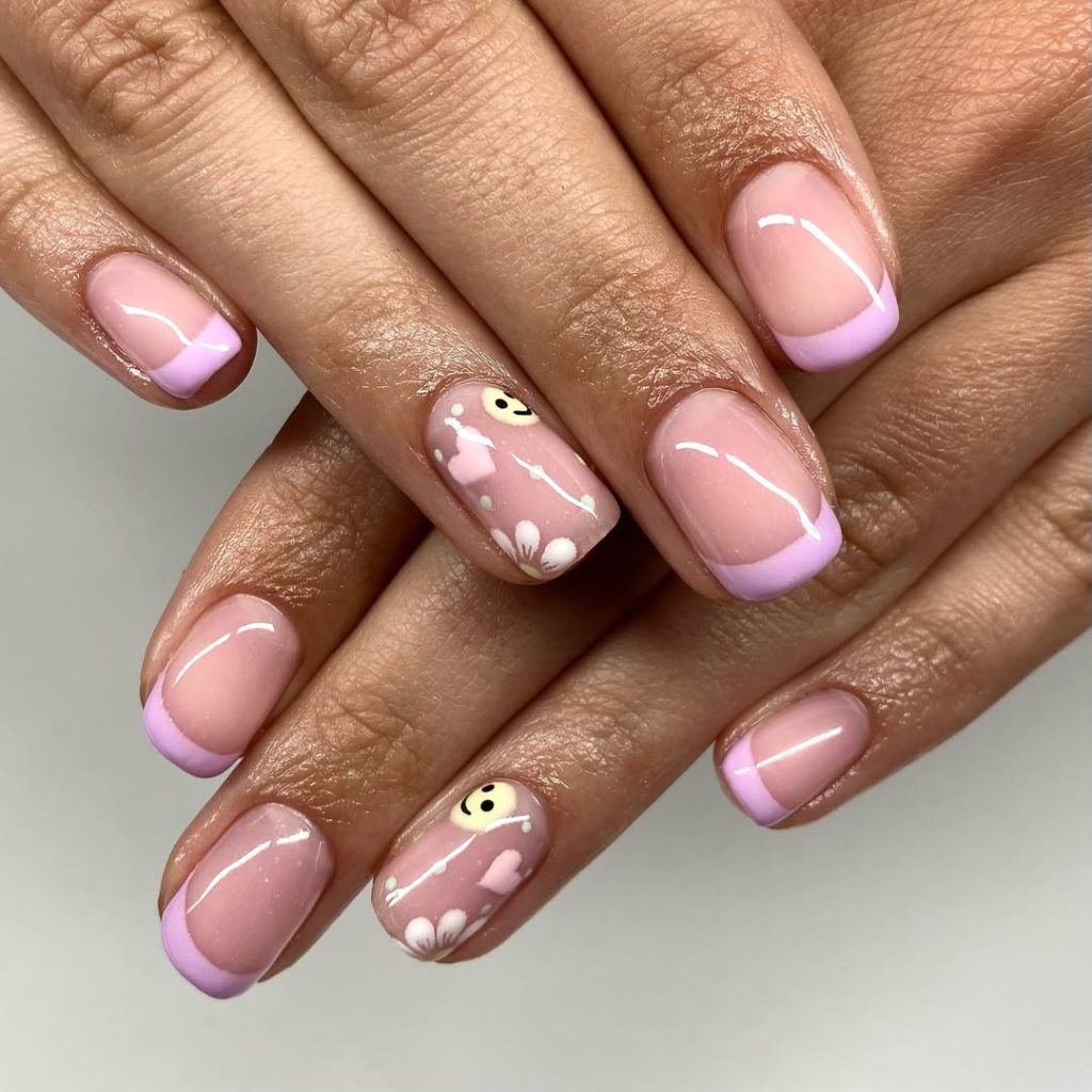 This manicure has a soft, dreamy quality that feels very on-trend for spring. The pale lavender French tip is subtle and elegant, while the tiny dotted details and floral accents add just enough art to keep things captivating. It’s delicate, polished, and incredibly wearable.