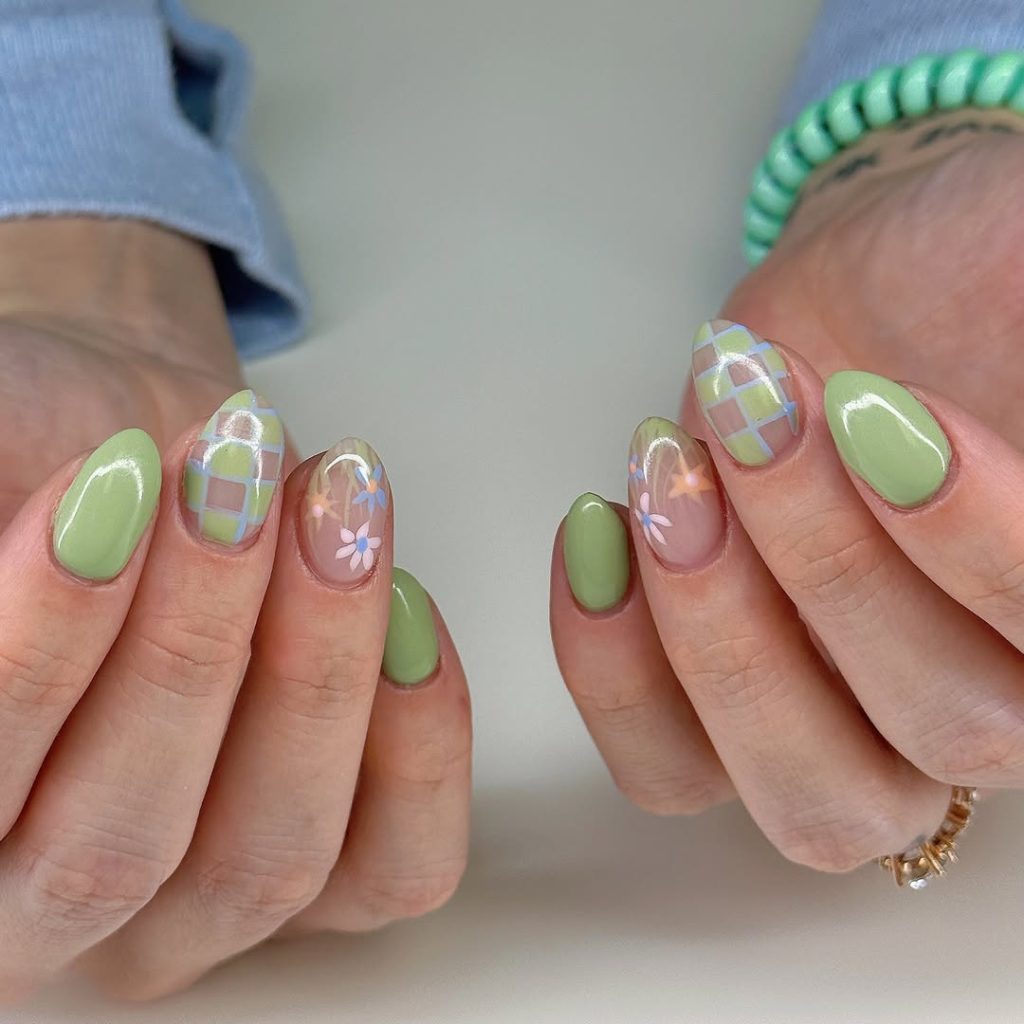 This manicure feels modern, fresh, and a little unexpected. The soft sage green brings a grounded, calming feel, while the pastel accent nails add lightness and creativity. It’s stylish without feeling overdesigned and has that effortless spring energy so many people crave.