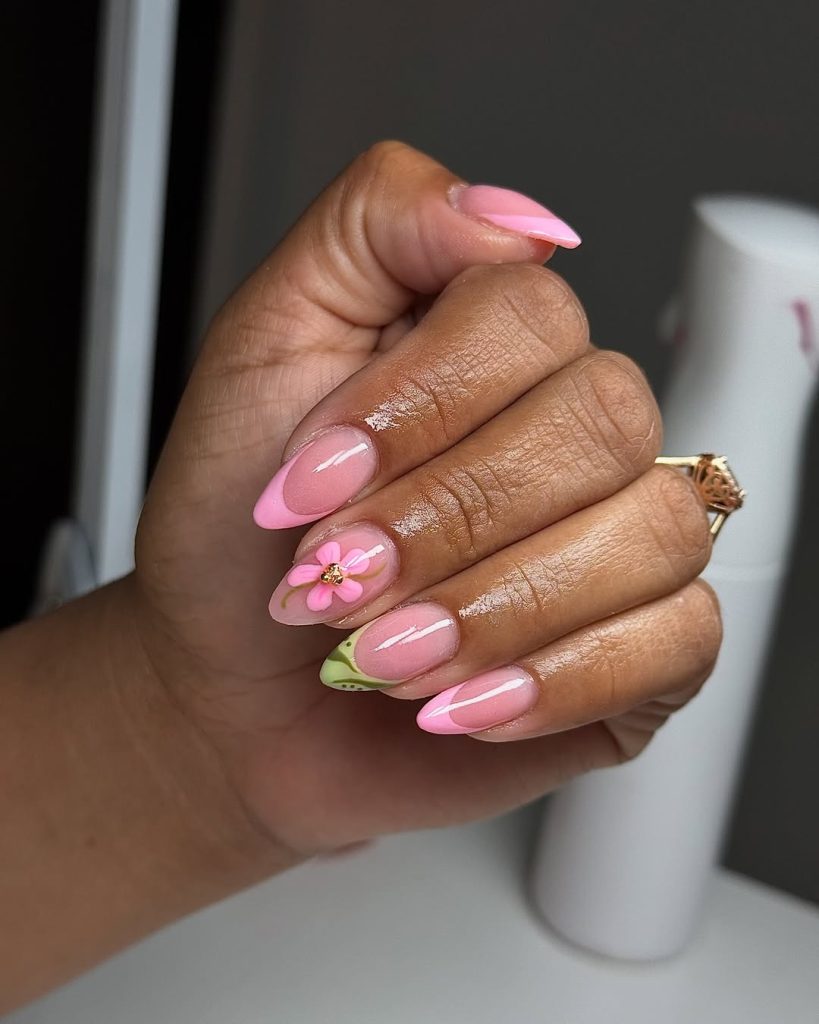 This manicure feels familiar in the best way. The clean French tips create a timeless foundation, while the small colorful floral detail adds a playful spring moment. It’s the kind of design that feels appropriate anywhere, yet still has personality.